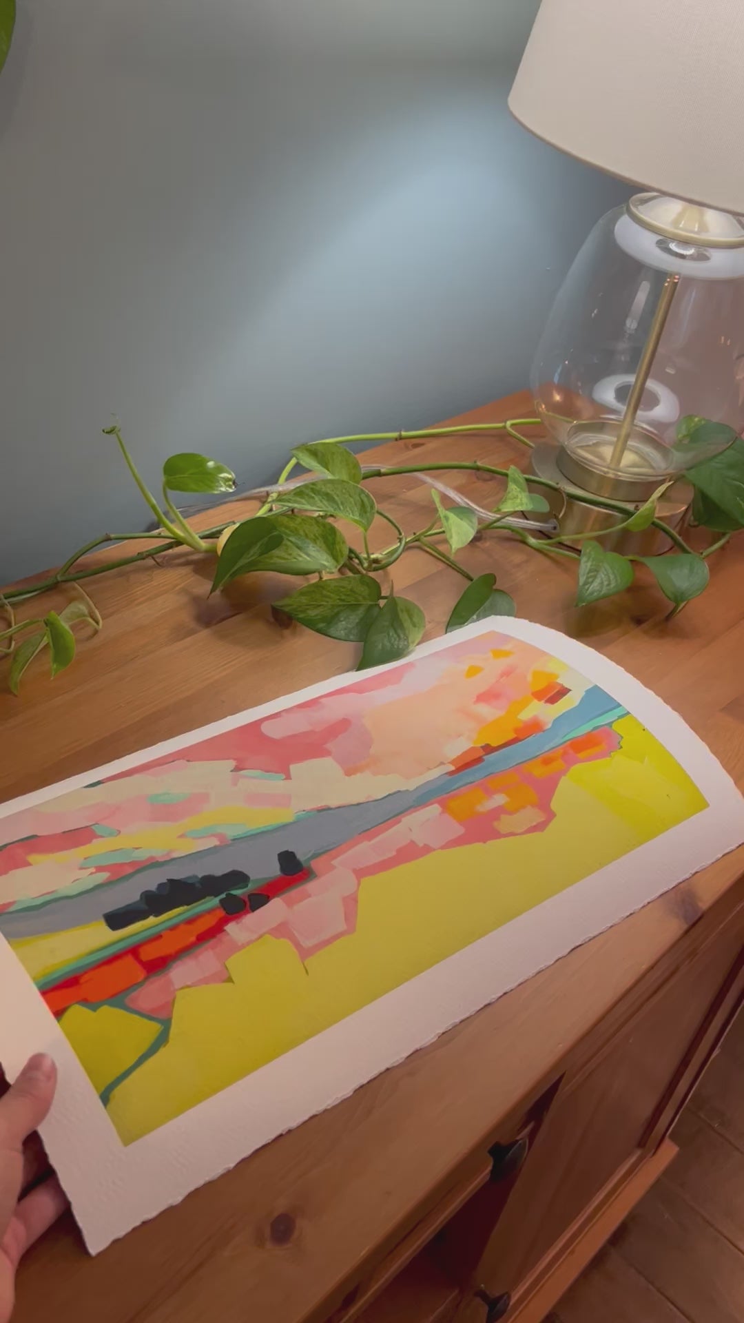 "LAKE Reflections," captures and abstracts the beauty of a stunning pink sky mirrored in a tranquil lake. Bold, colourful brushstrokes form the reflection, depicting the vividness of the sky with a harmonious blend of hues. Glimpses of the underlying teal background peek through, adding depth and contrast to the overall composition.