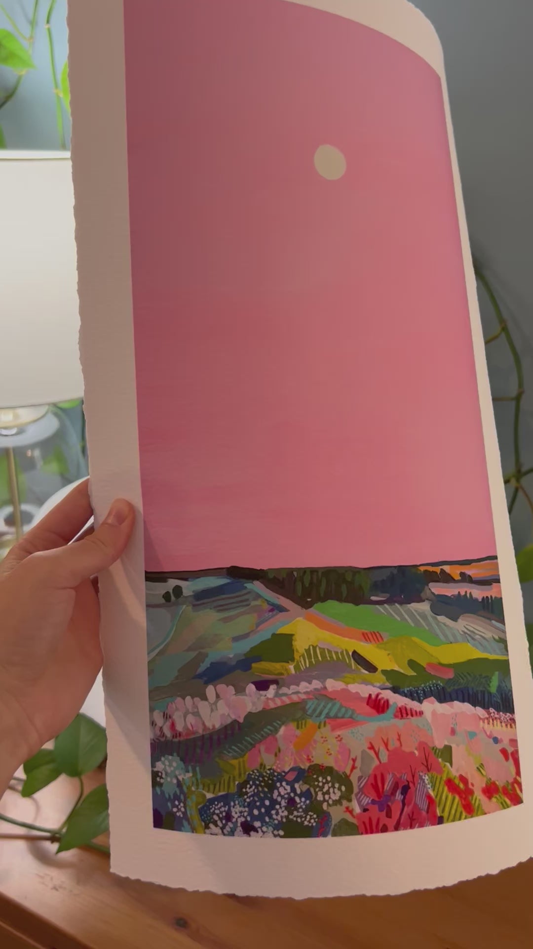 layers of playful textures, and colourful shapes are assembled together to capture a portrayal of undulating fields beneath a a wide open pink sky.