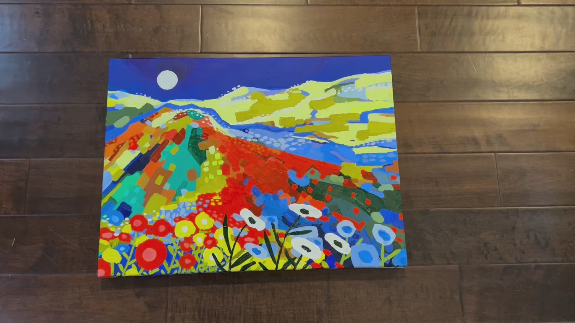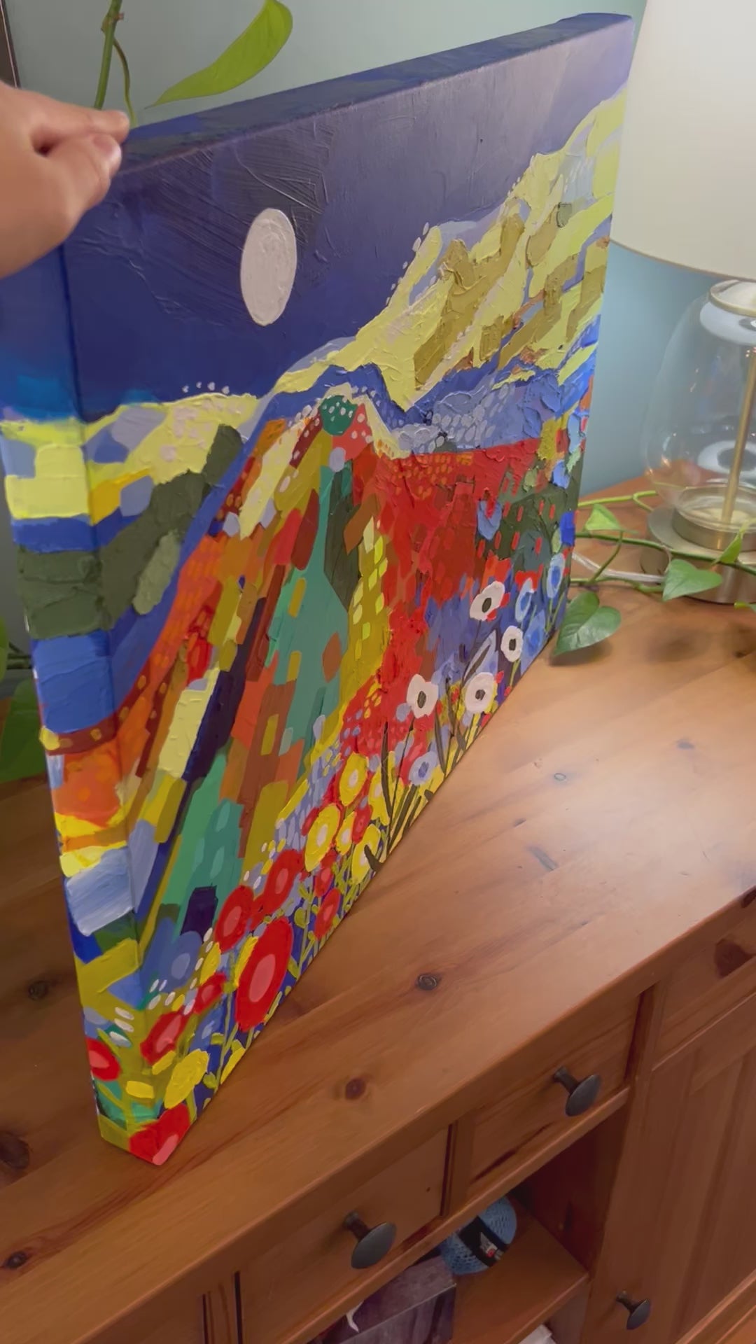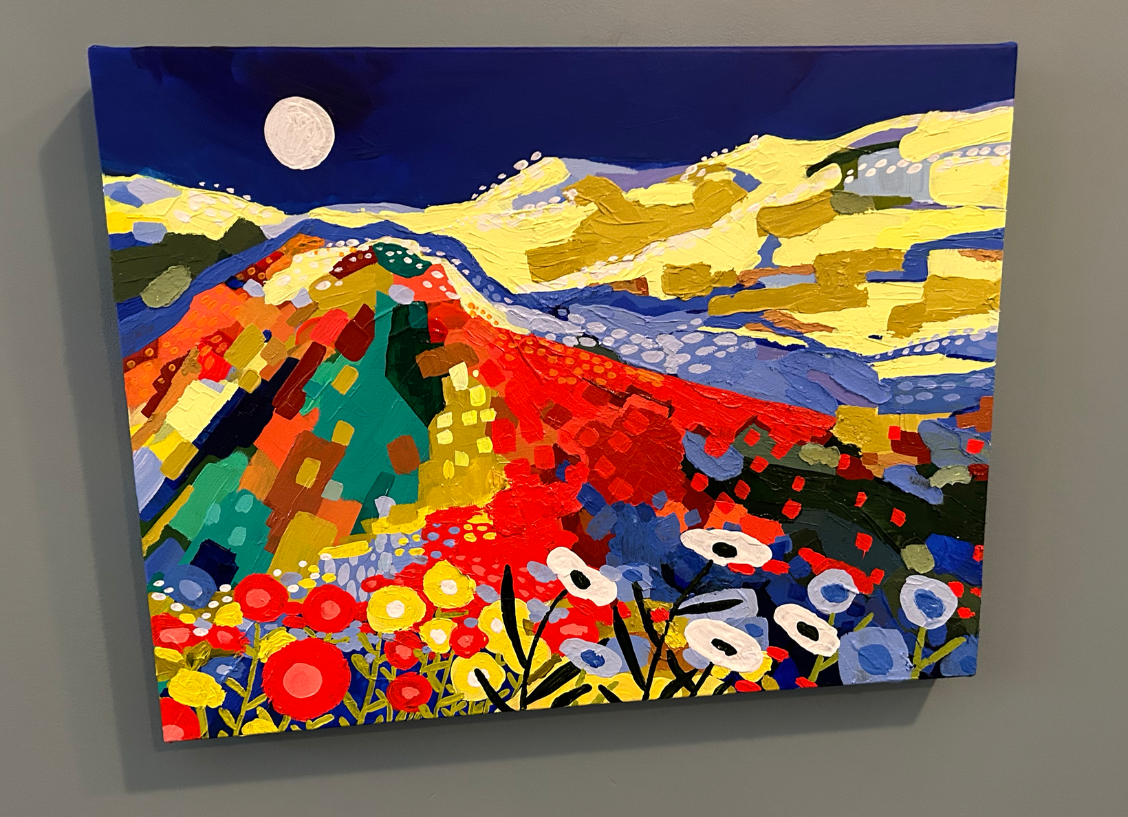 The interplay of colour, texture, and celestial illumination creates an entrancing and abstracted vista of moonlit hills and floral landscapes.