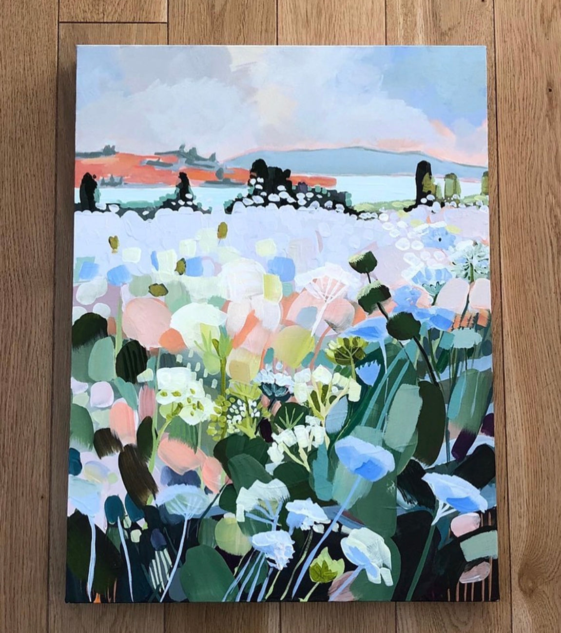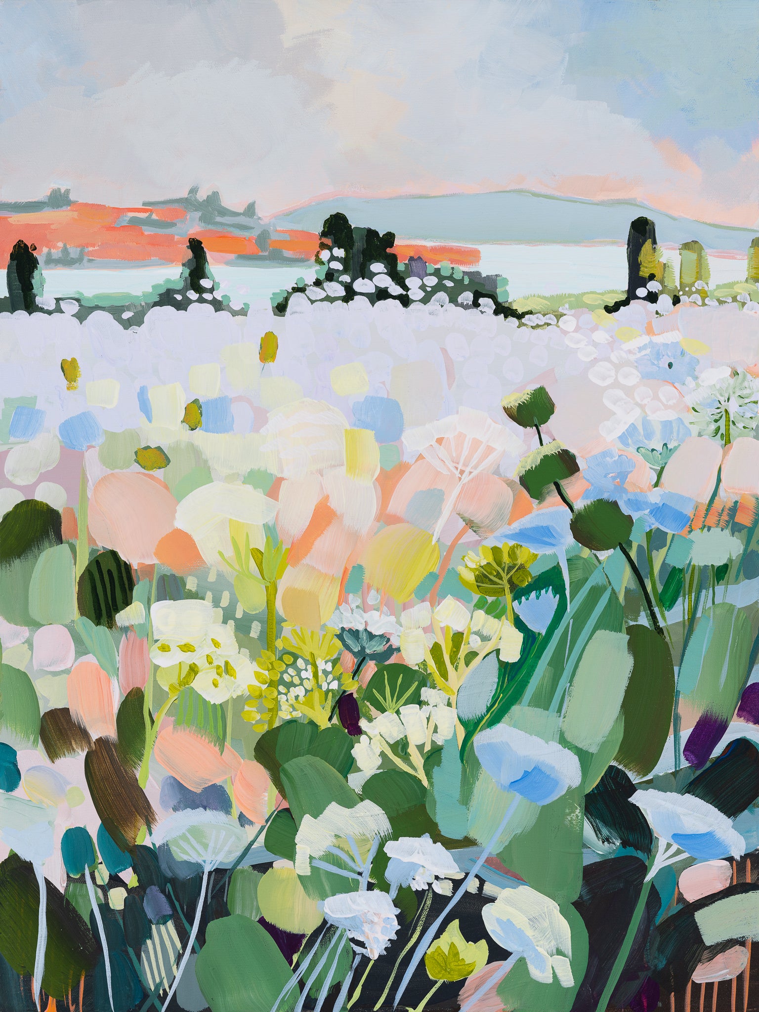 The goal of my artwork, Okanagan Vibes, was to capture the soft pinks, blues, and greens attributed to spring mornings in a typically arid climate. It was also a way for me to express my gratitude for a moment that was filled with so much beauty and aliveness.