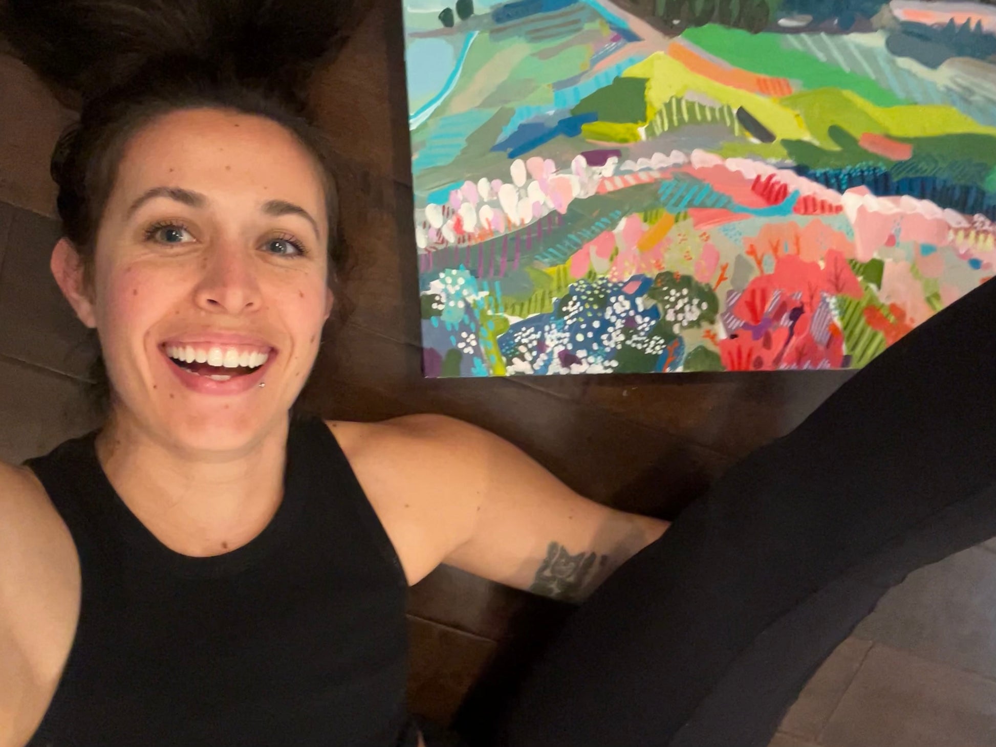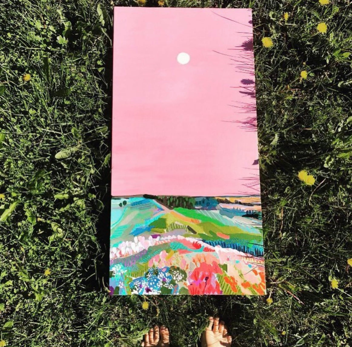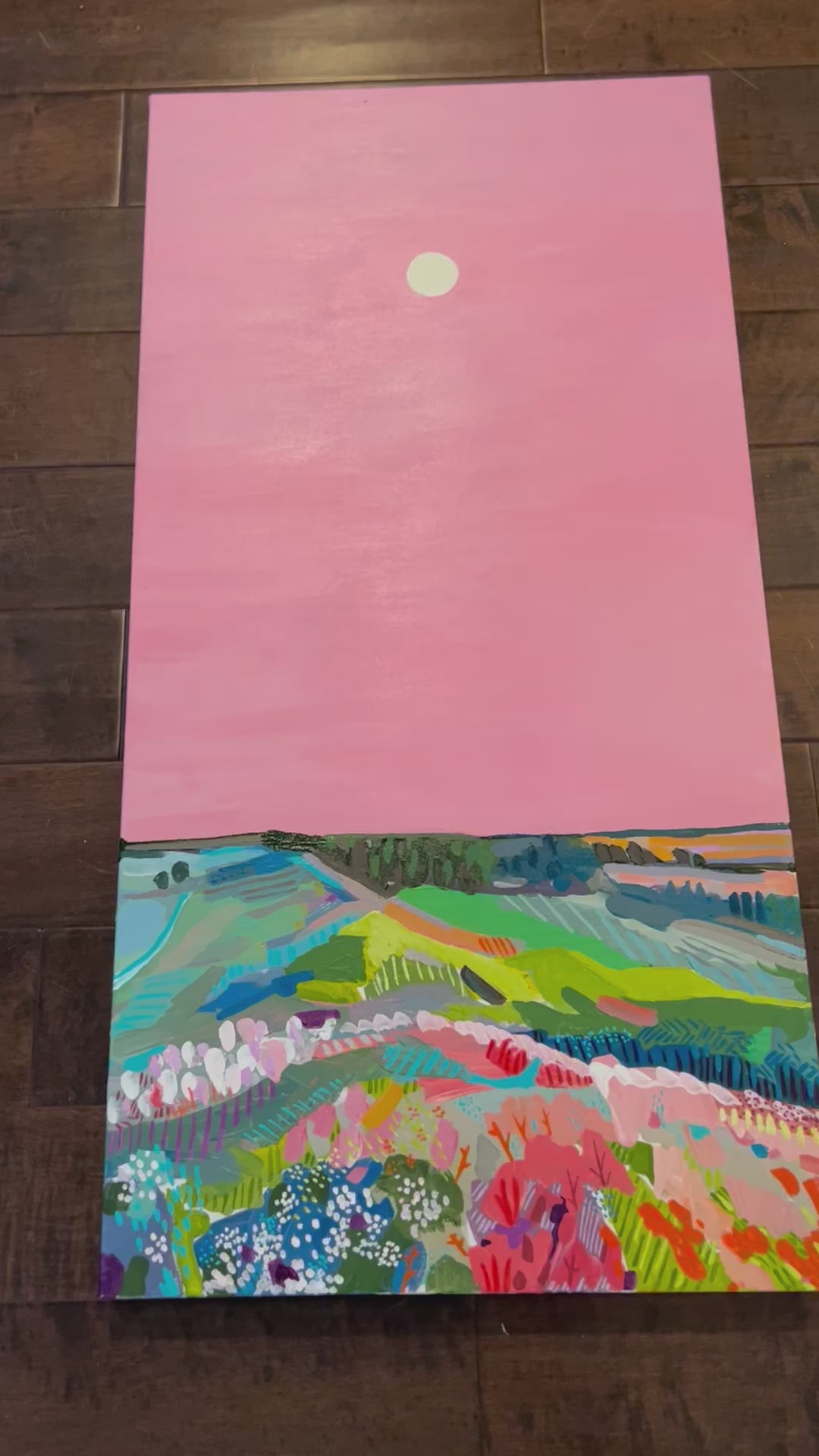 In this 18x36 acrylic landscape piece, layers of playful textures, and colourful shapes are assembled together to capture a portrayal of undulating fields beneath a a wide open pink sky.