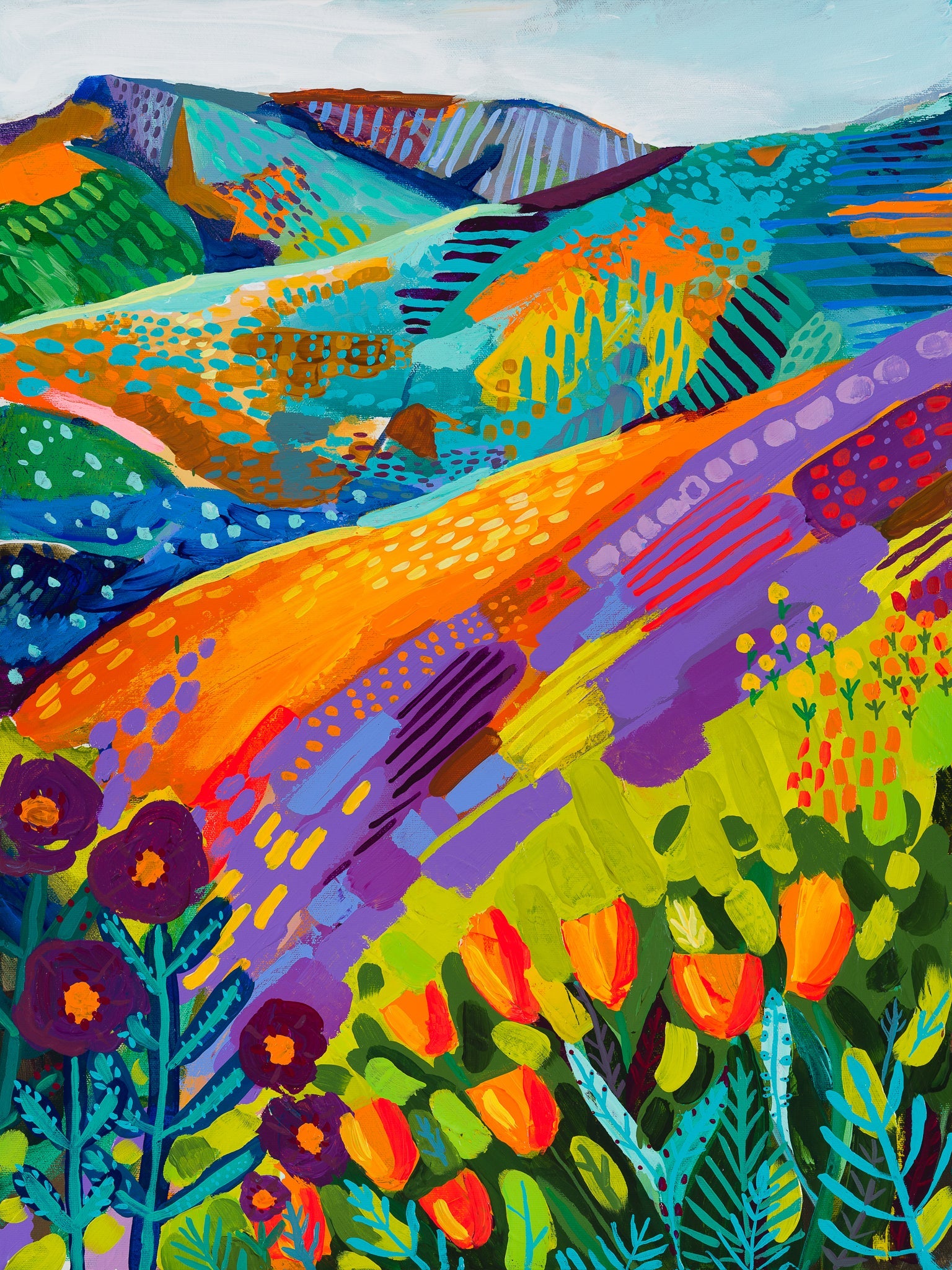"Purple Fields" Invites you to embrace the beauty of nature's floral tapestry. The canvas bursts with bold brush strokes, vibrant colours and playful marks.